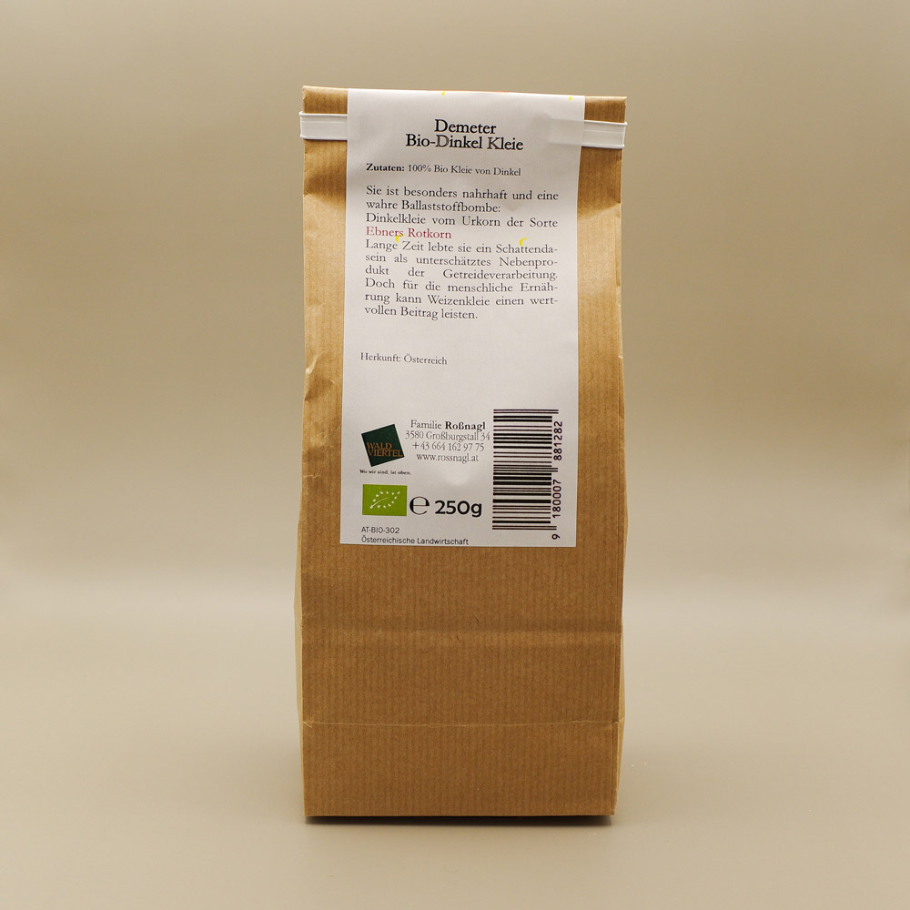 Unsere Dinkel-Kleie ist vielseitig verwendbar: im Frühstücksbrei, als Beigabe im Müsli, in Brotteigen, im Salat oder einfach ins Joghurt gemischt. Bitte achte bei der Verwendung von Kleie auf die erforderliche erhöhte Flüssigkeitszufuhr. Unser Dinkel wächst auf unseren bio-dynamischen Feldern im Waldviertel und hat Demeter-Qualität.